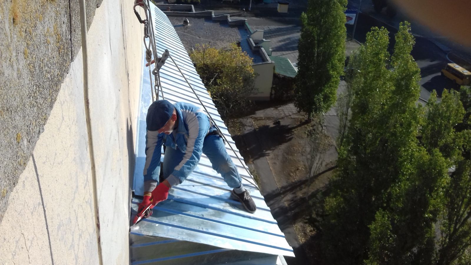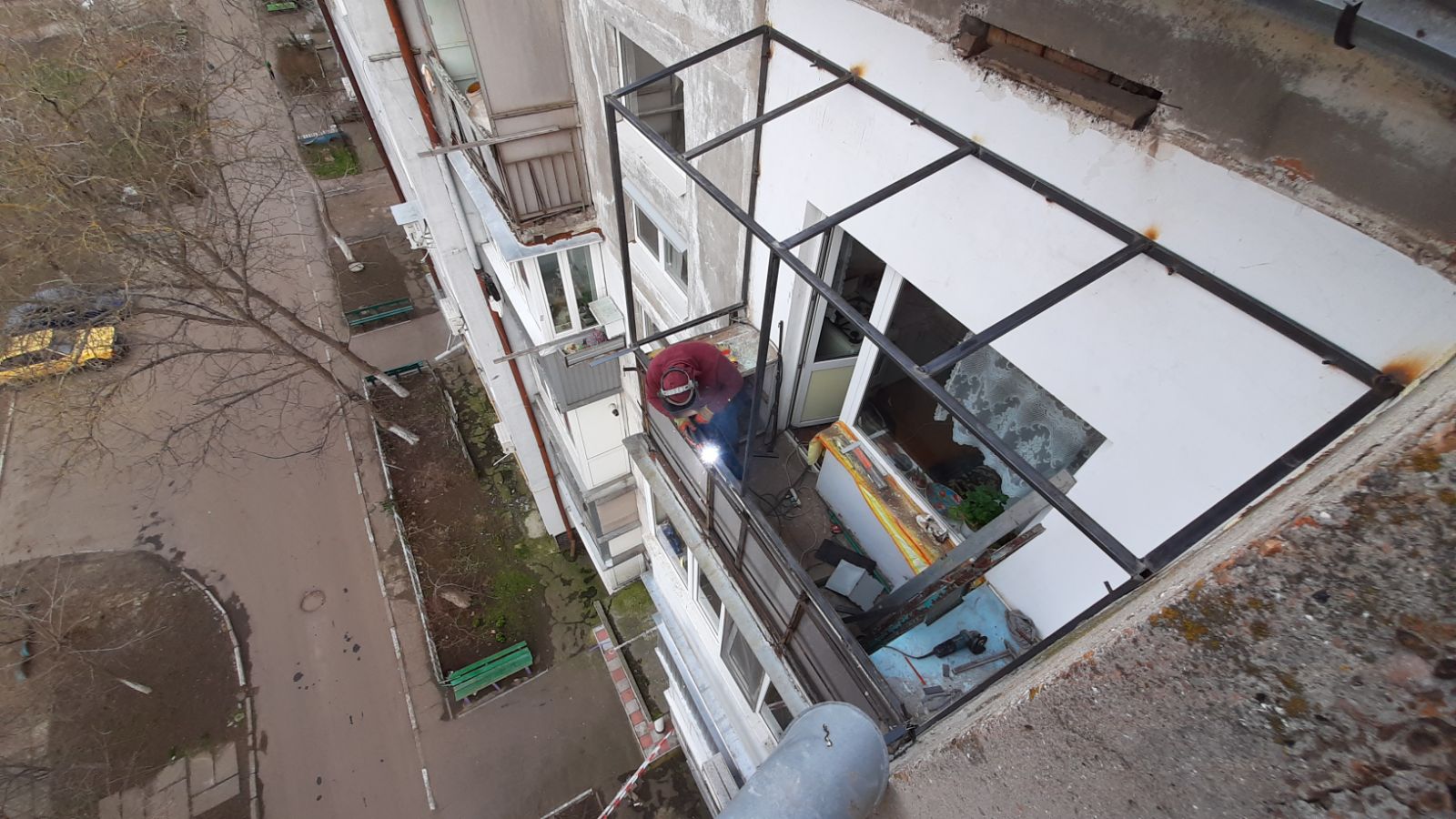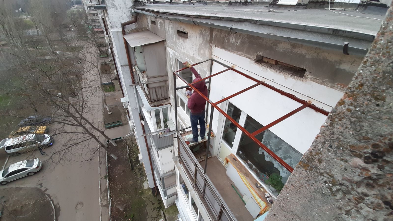 Работы должна проводить пара специалистов с высотным снаряжением - страховкой монтажника на открытой плите балкона.
