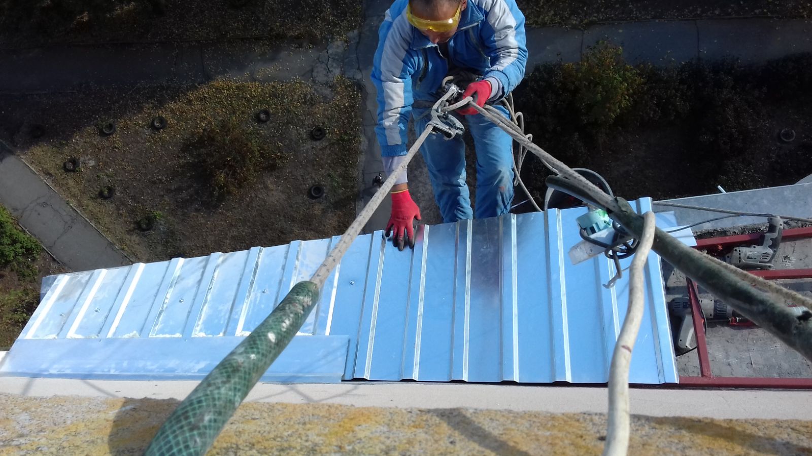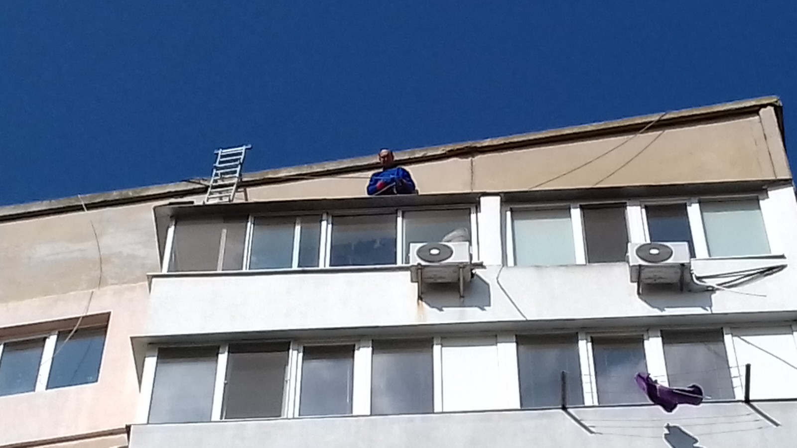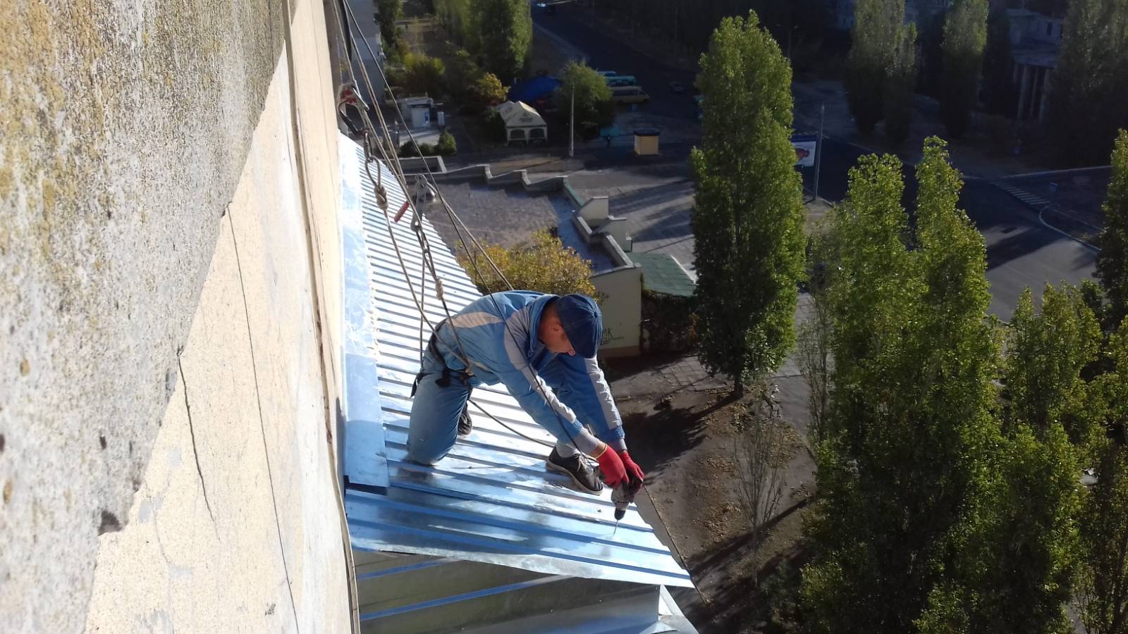 Работы должна проводить пара специалистов с высотным снаряжением - страховкой монтажника на открытой плите балкона.